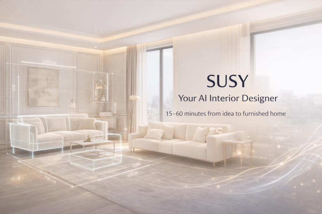 Susy helps you plan your home from first idea to a confident, shoppable room plan. Measure your space, explore layouts, visualize in 3D, and stay in control of style and budget — all in one calm, guided flow.